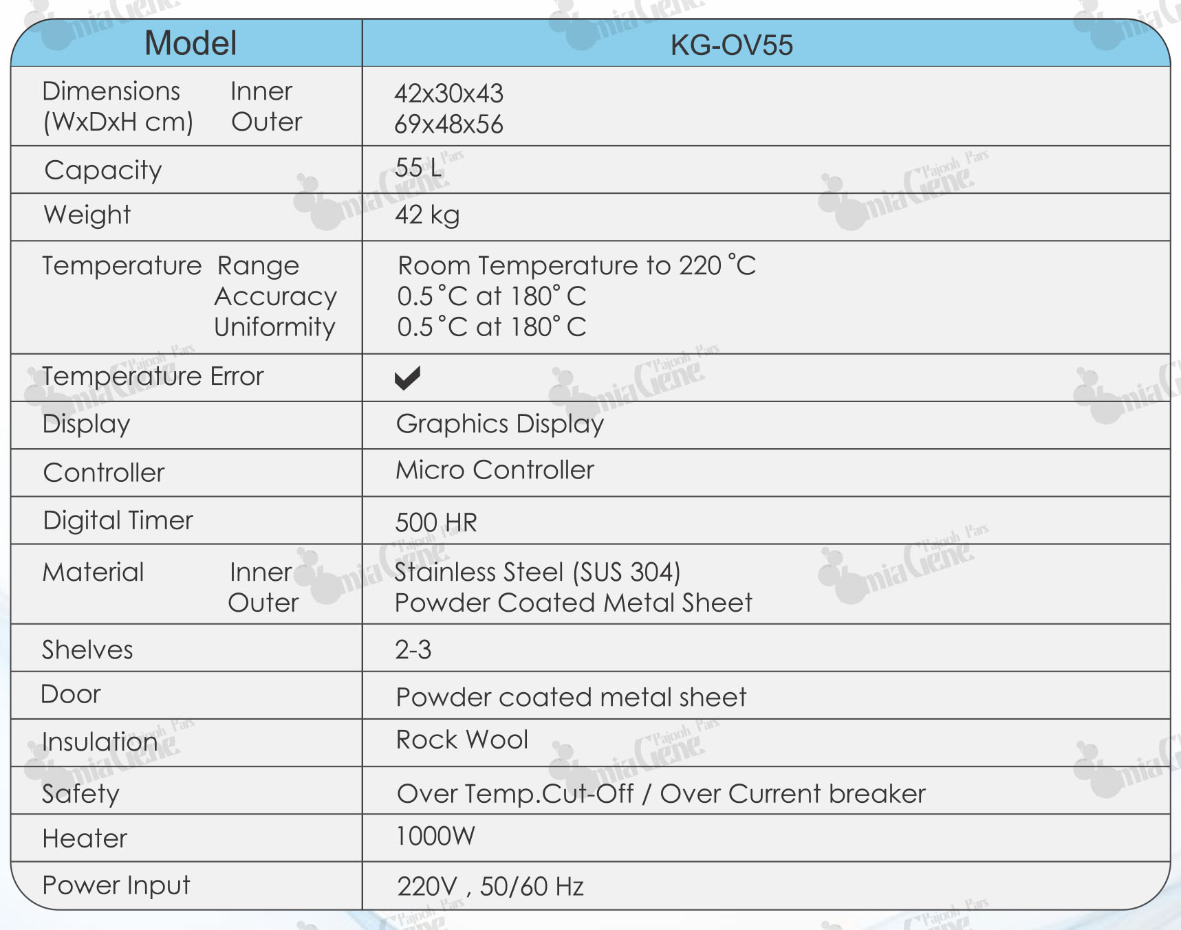 جدول مشخصات فنی آون آزمایشگاهی کیمیاژن پژوه پارس